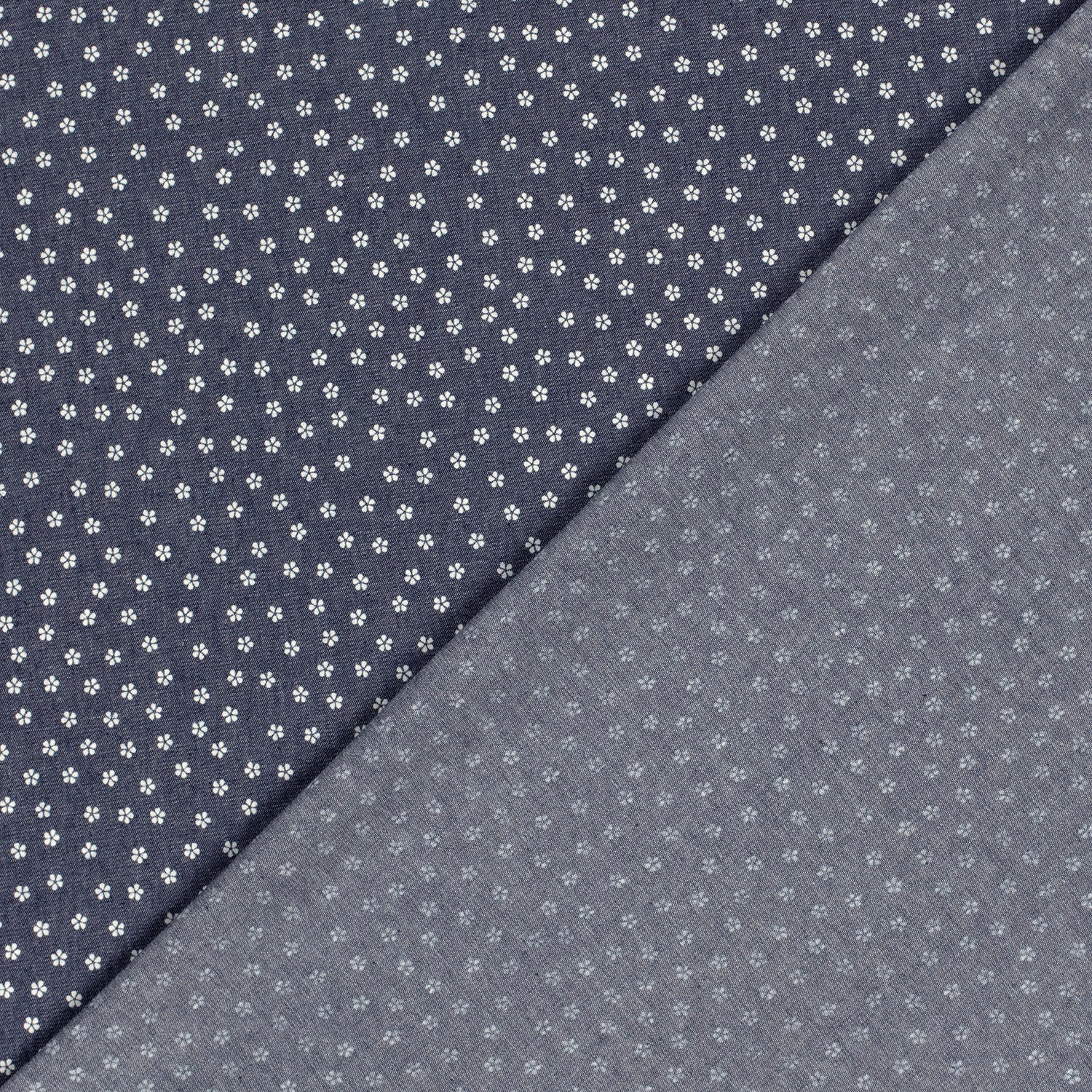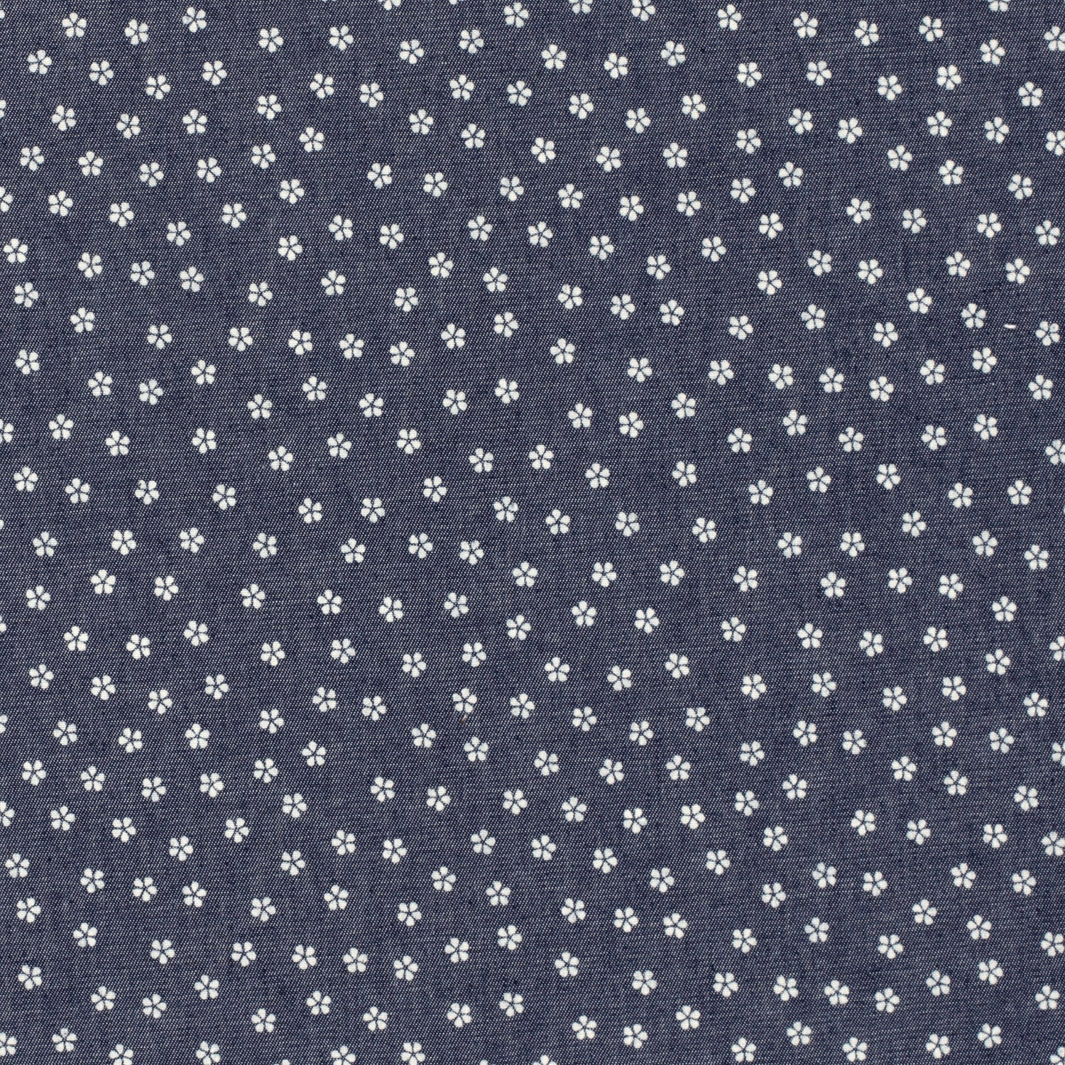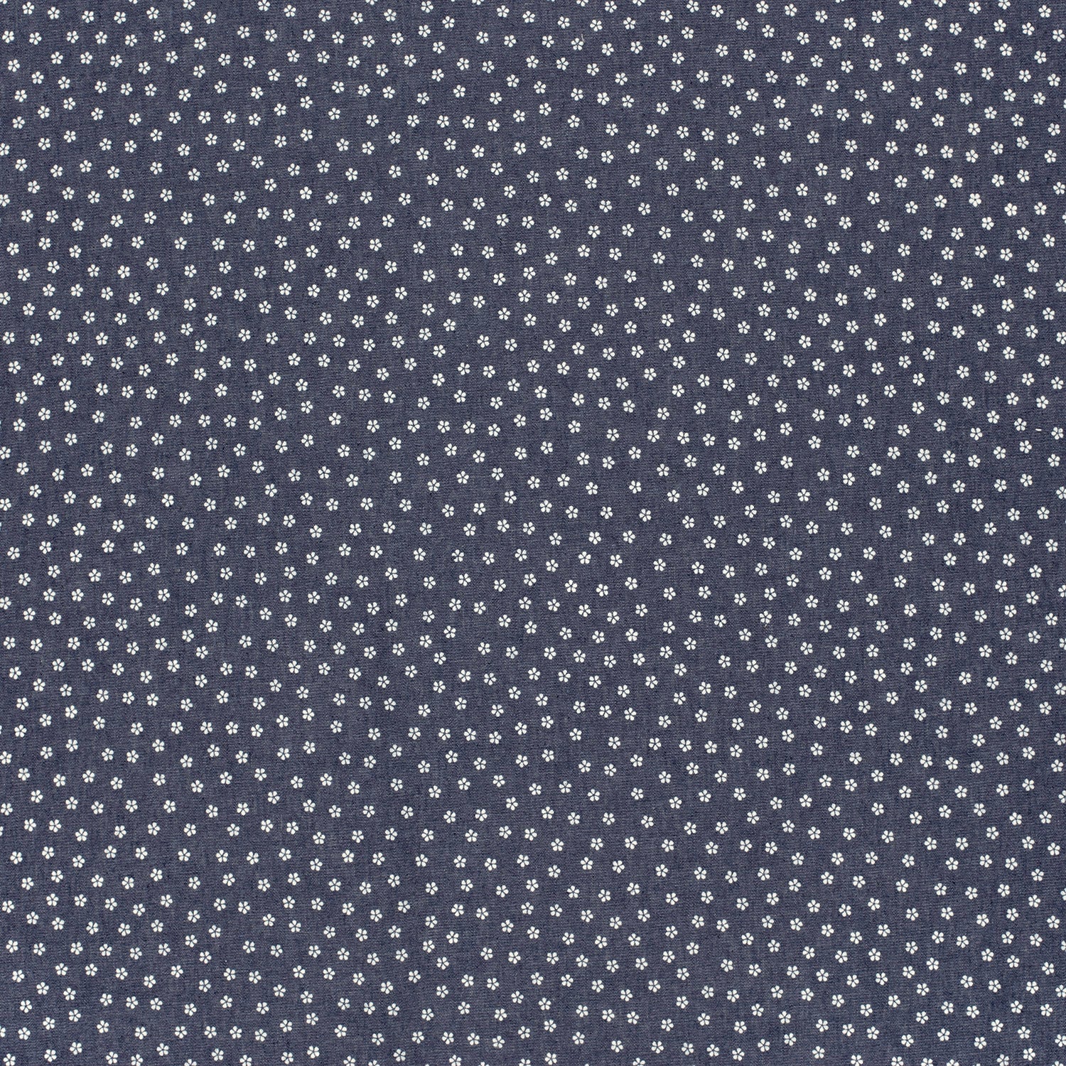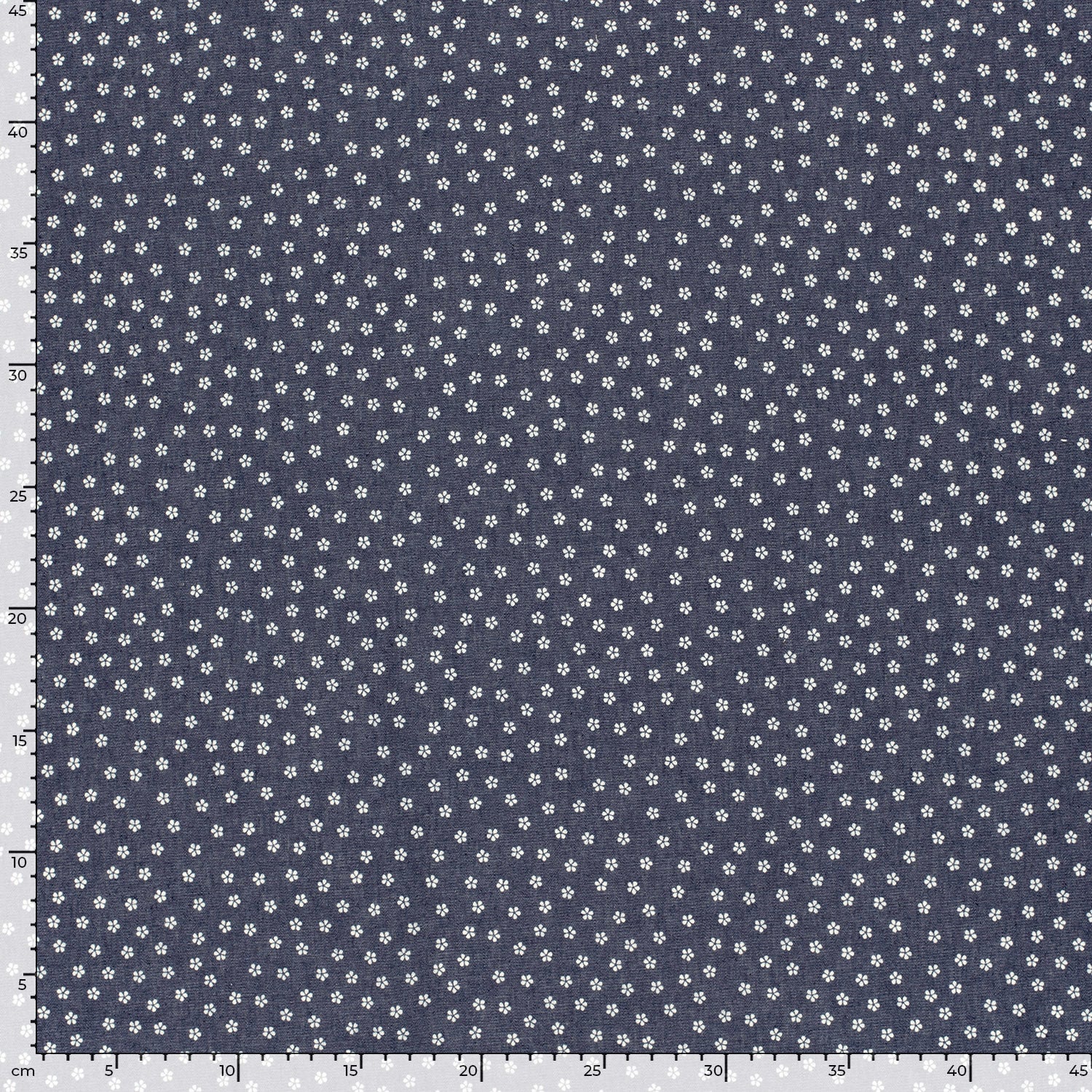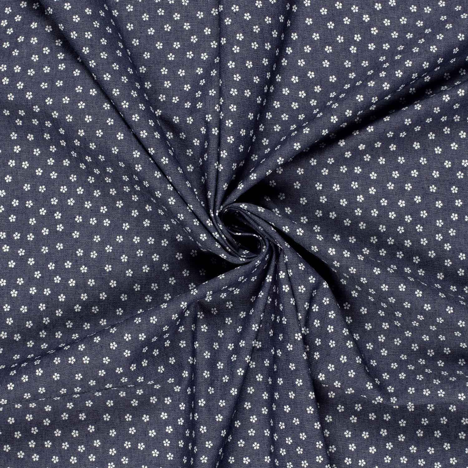 Mönstrad denim med blommorPassar väl till kläder, byxor, kjolar, och mycket merMaterial: 100 % BomullBredd: 147 cmVikt: 130 g/m2Certifikat: Öko-texTvättråd: 30 Grader, ej tumlingFärger på skärmar varierar, är du osäker beställ tygprov.