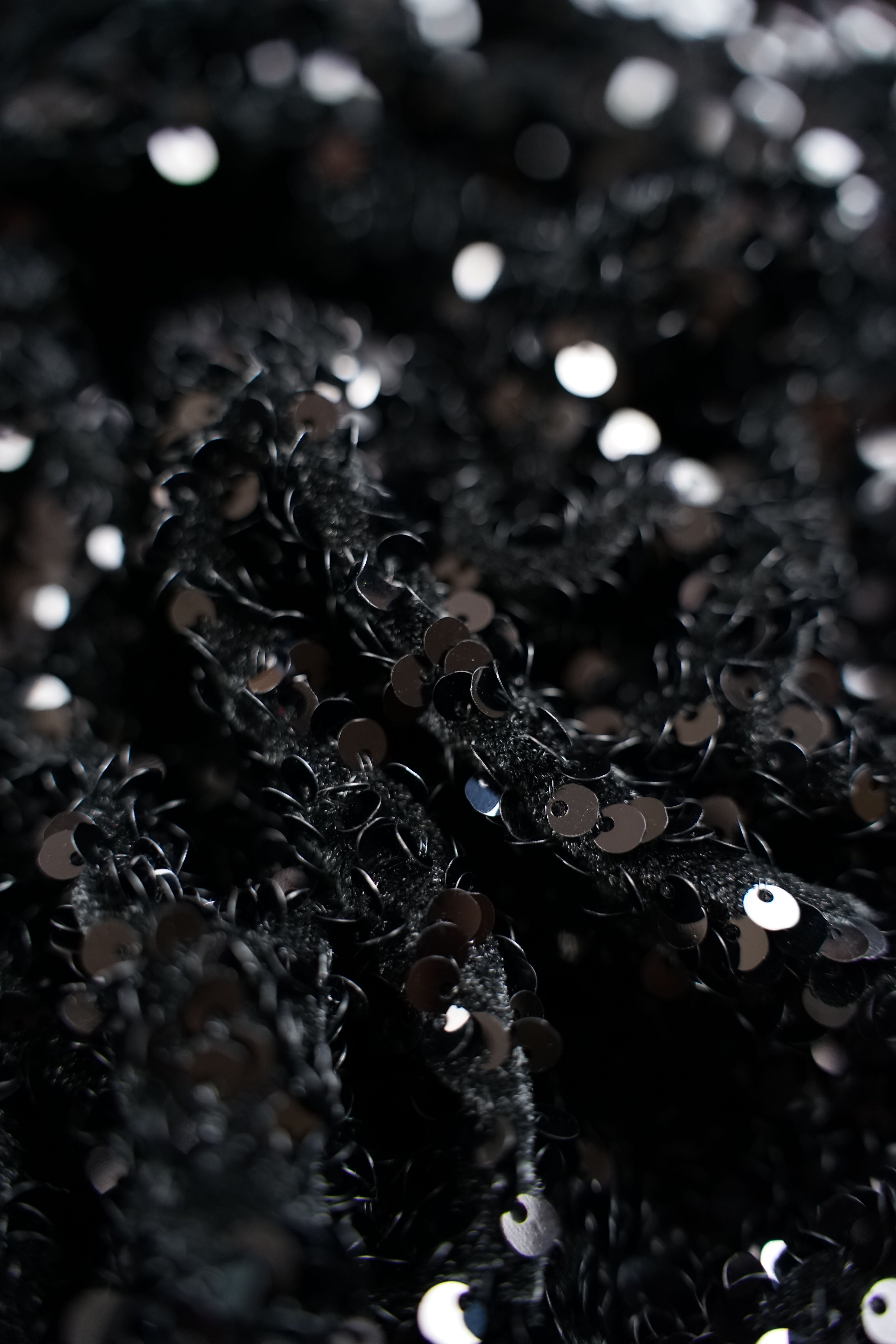 Material: 100% PolyesterBredd: 120 cm av paljetter, 140 cm totalt med velour-kant Vikt: 500 g/m2