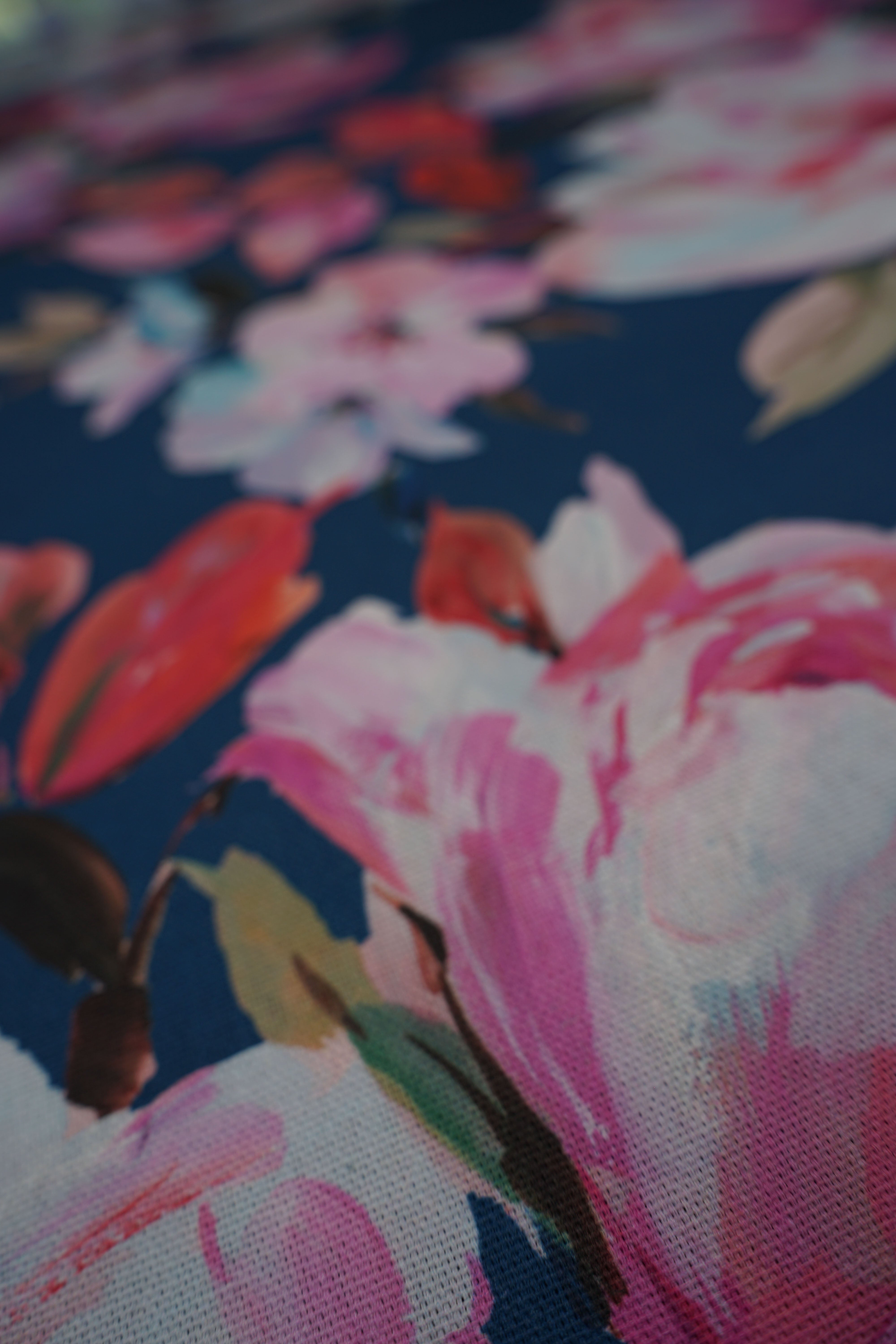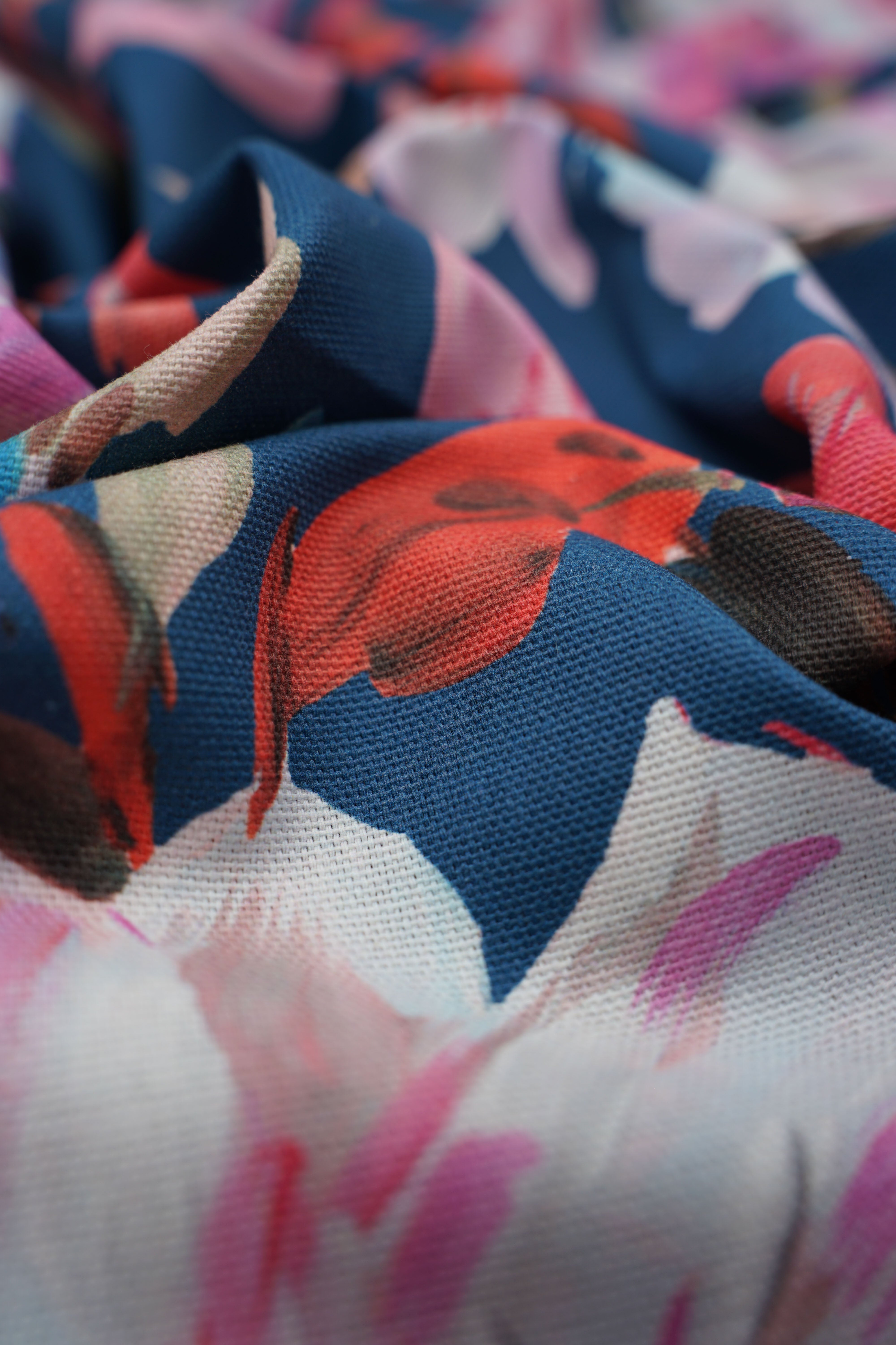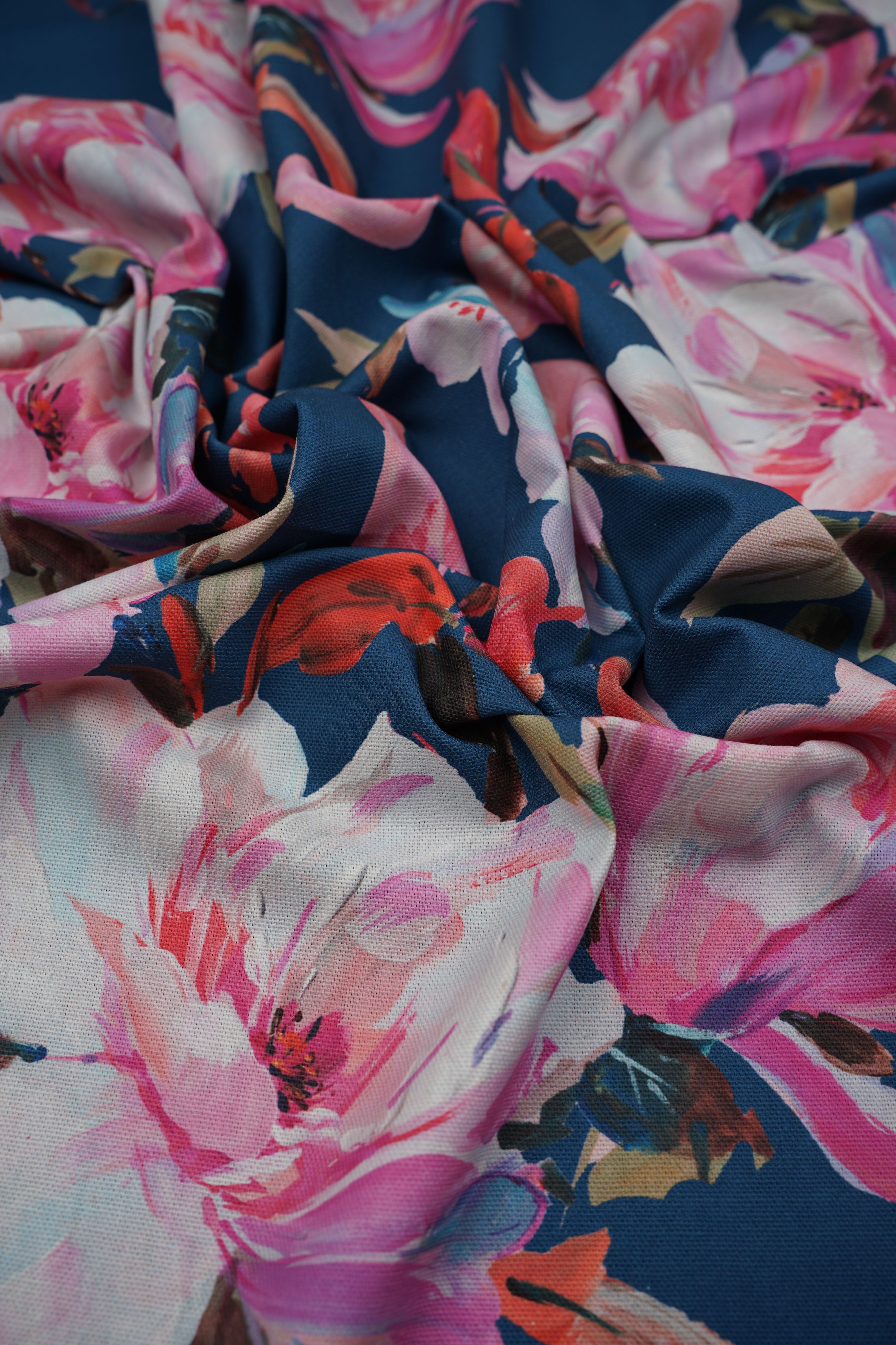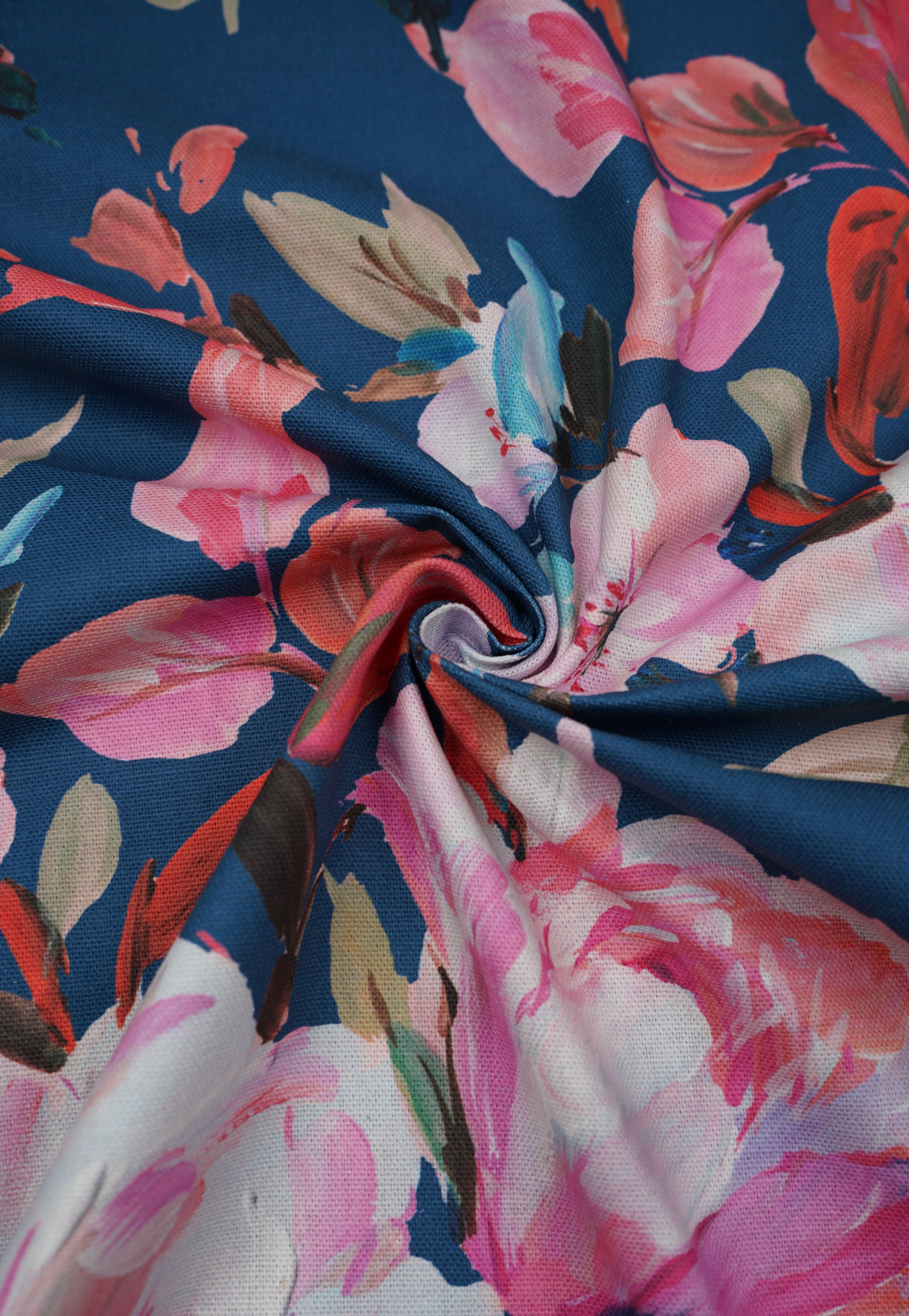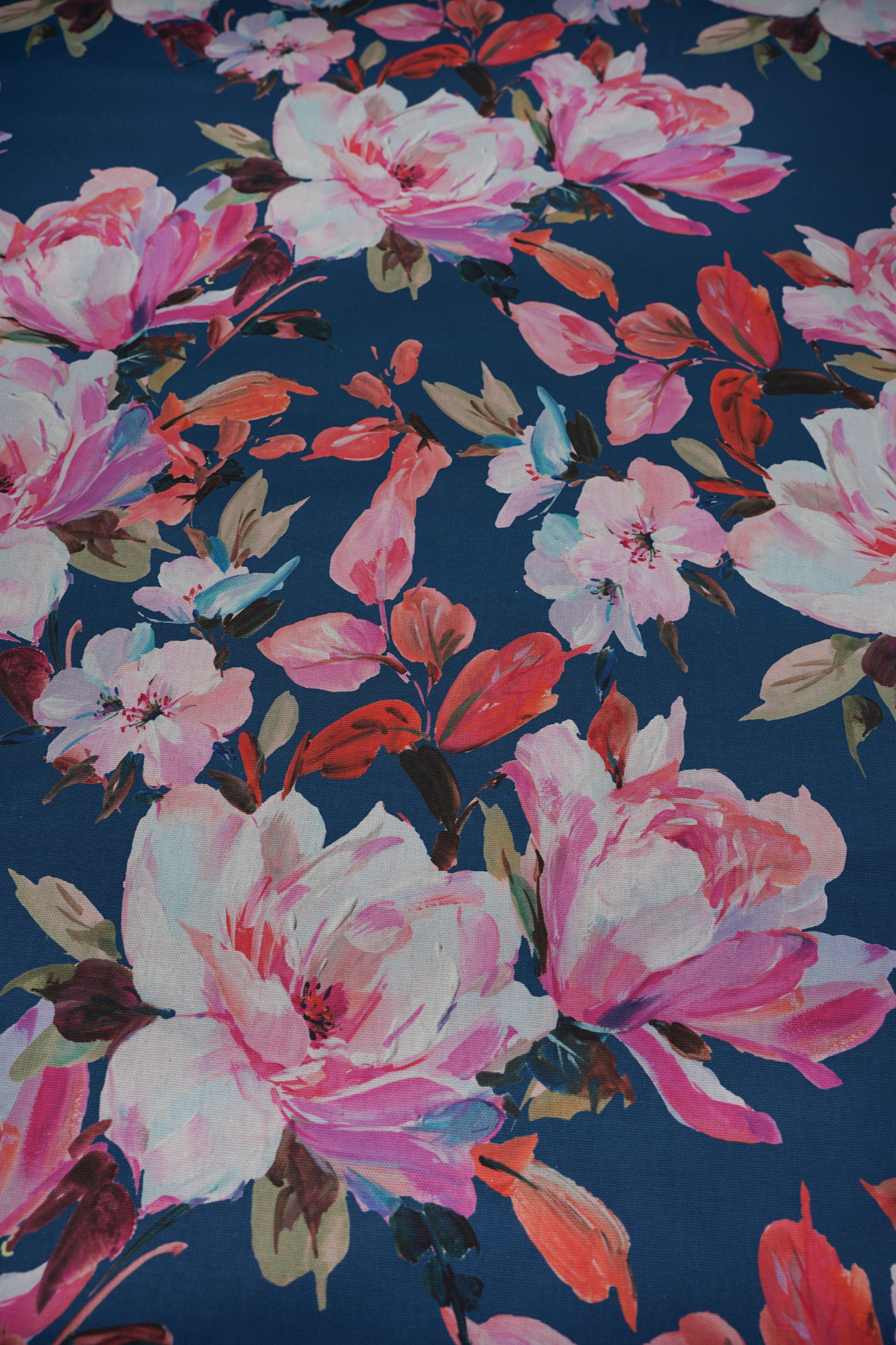 Gardintyg i Bomull - Stort vackert Blomstermotiv - Blå
