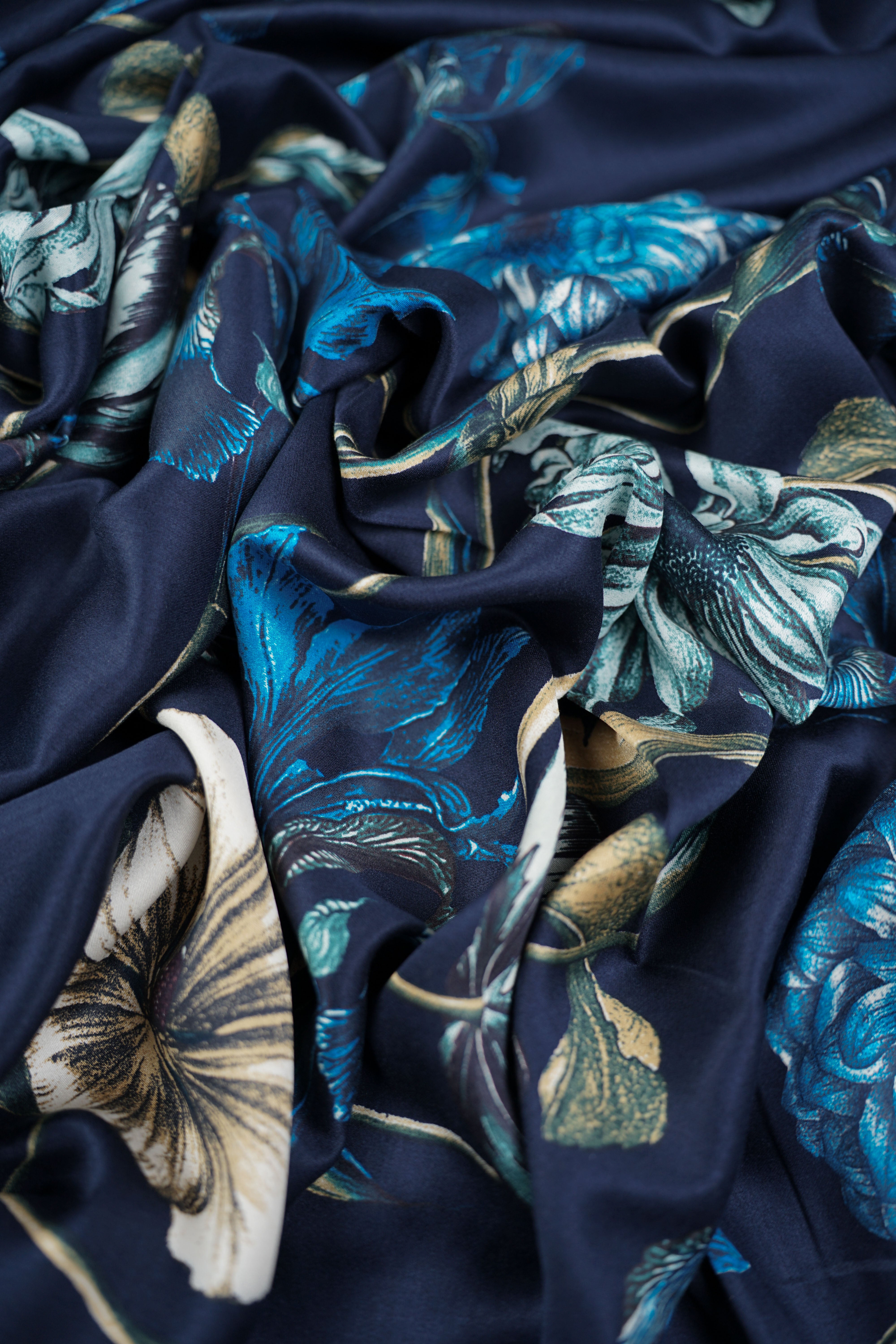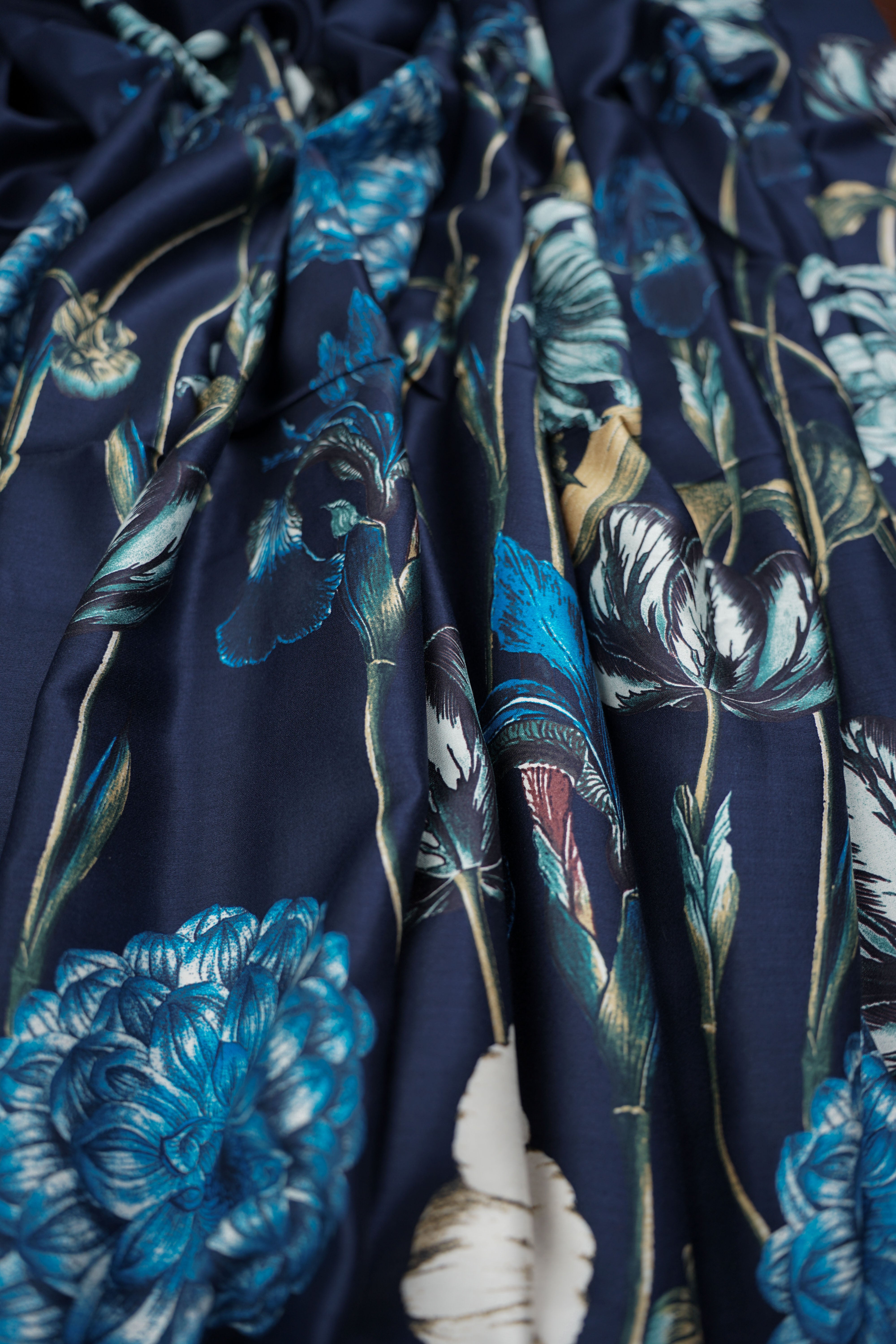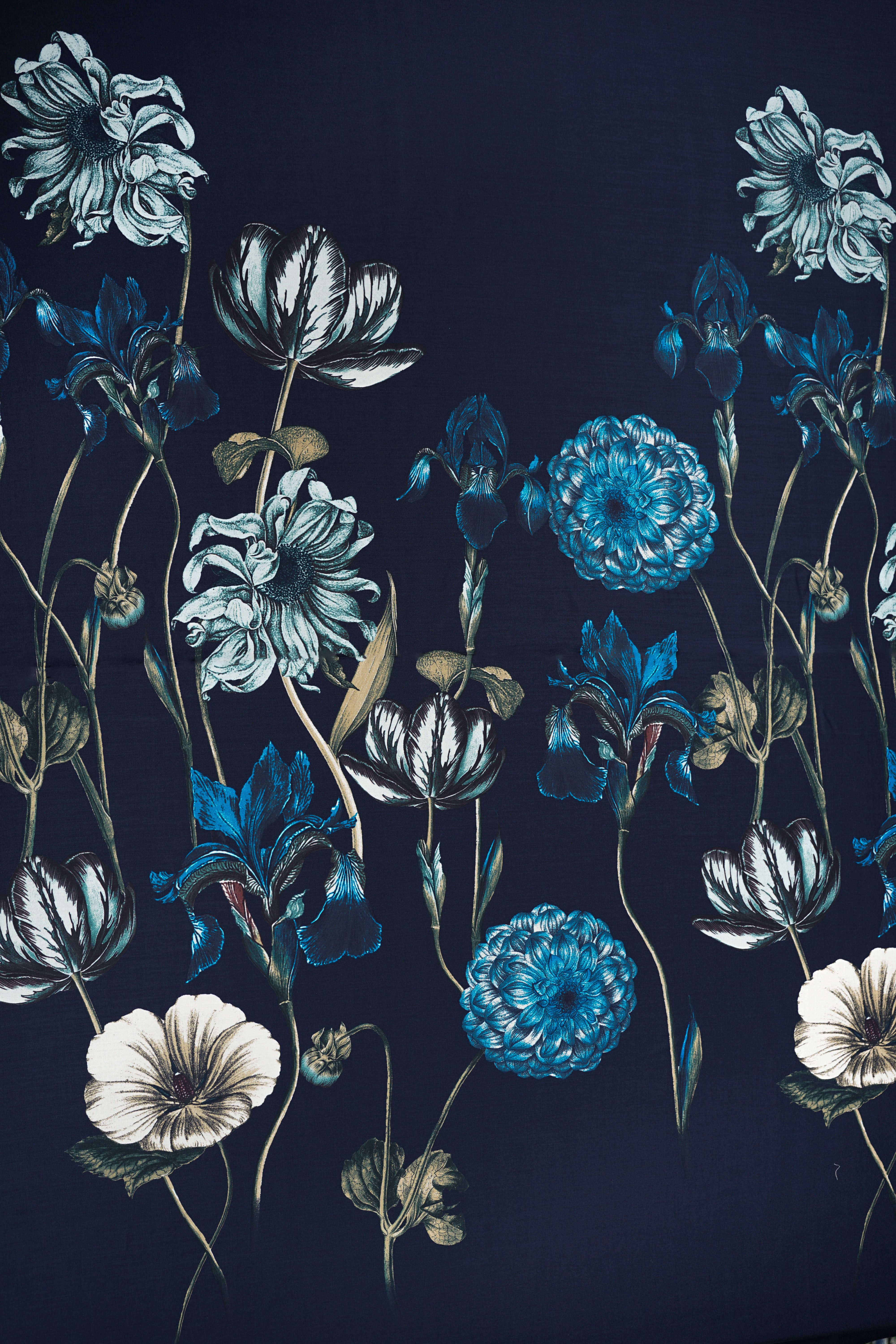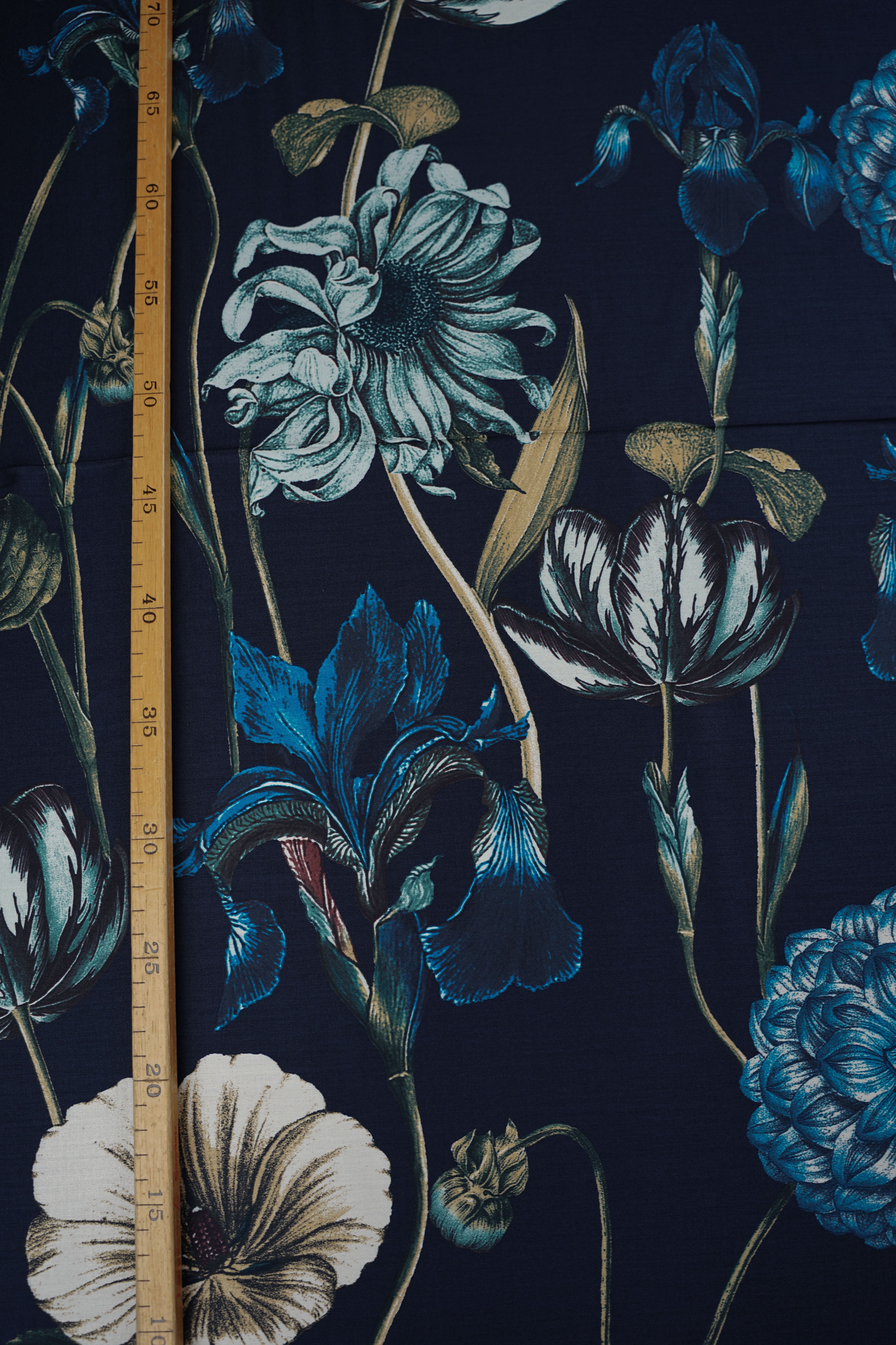 • Viskossatin - Stort vackert mönster - Blommor - Marinblå