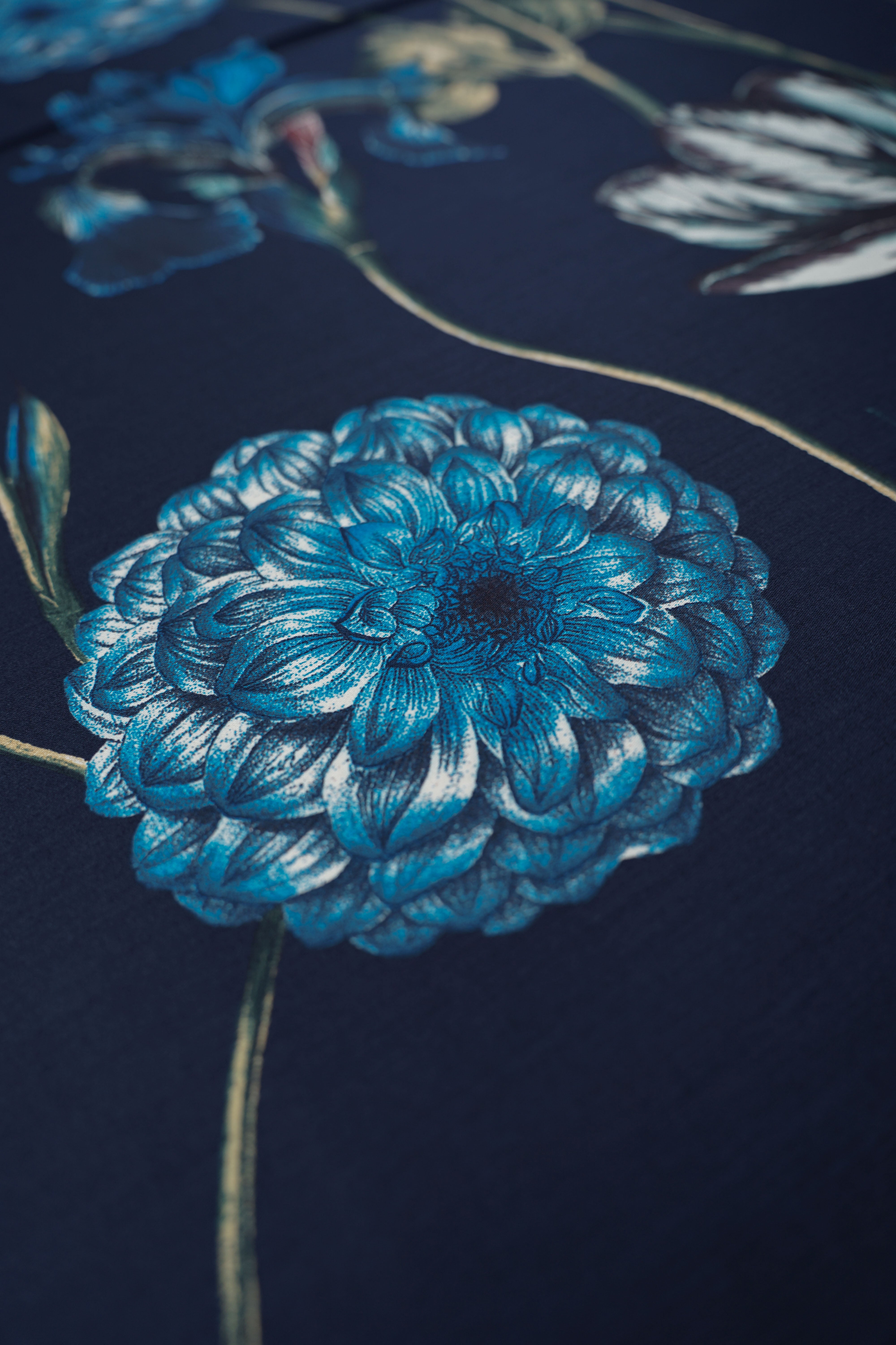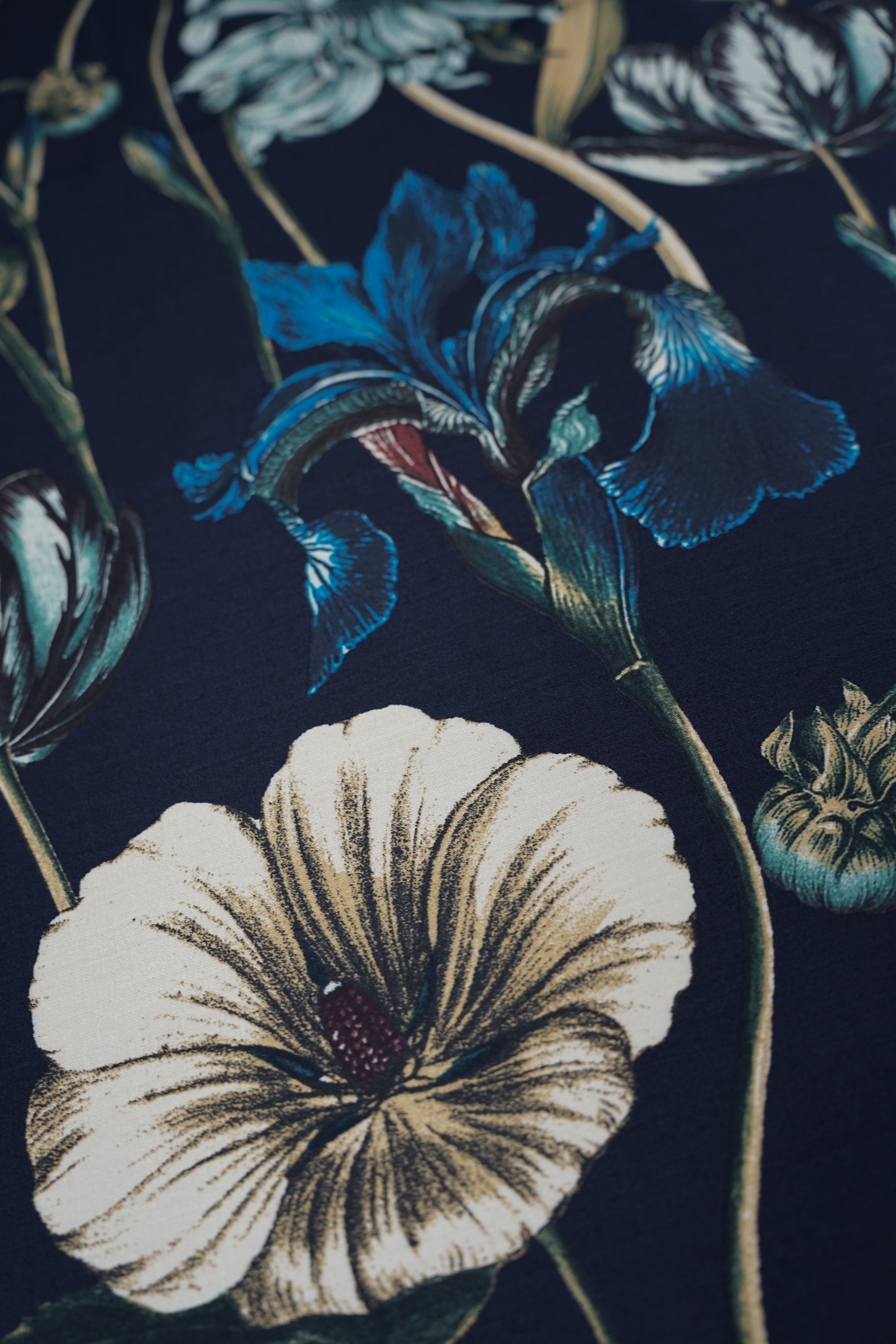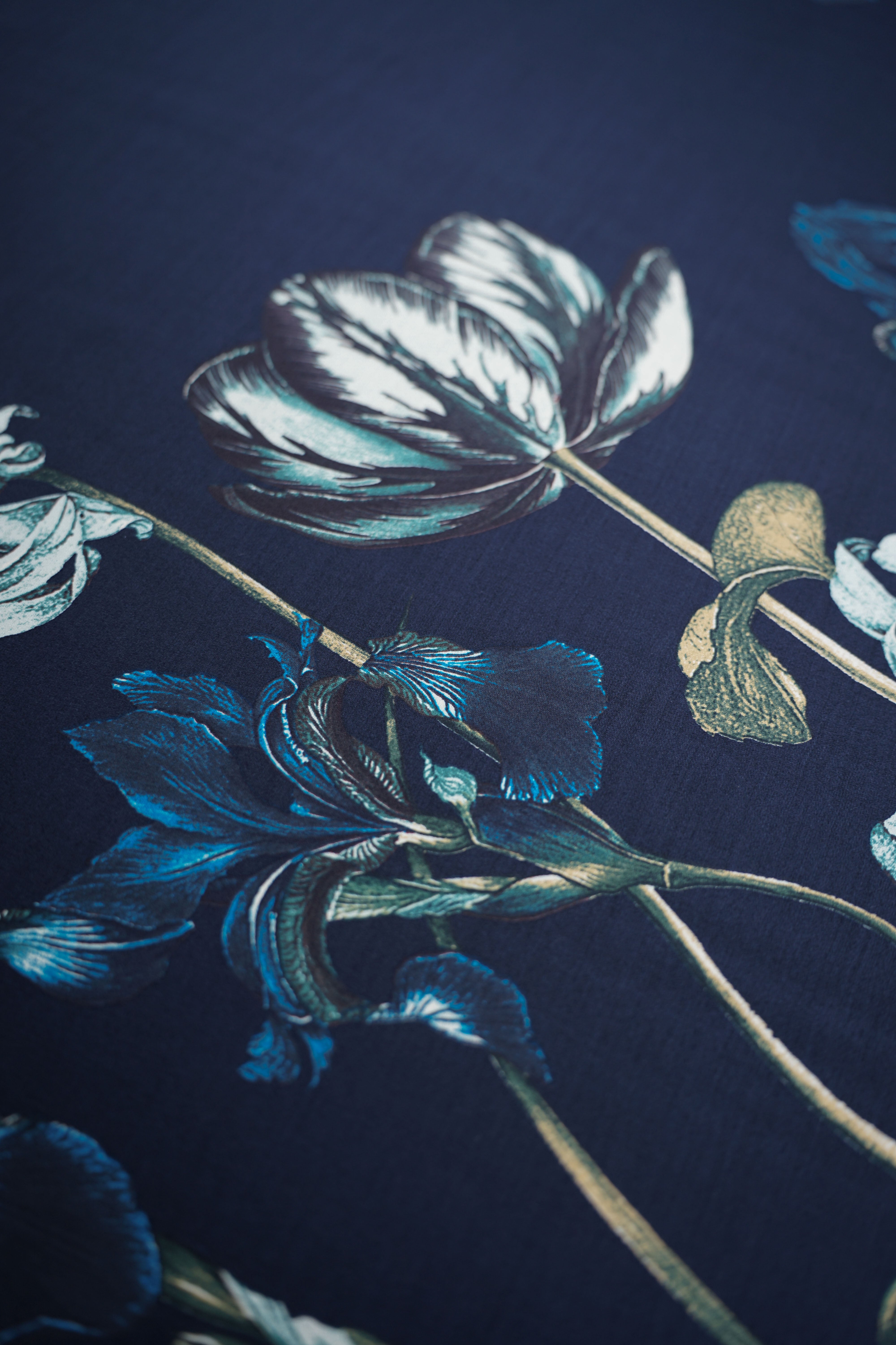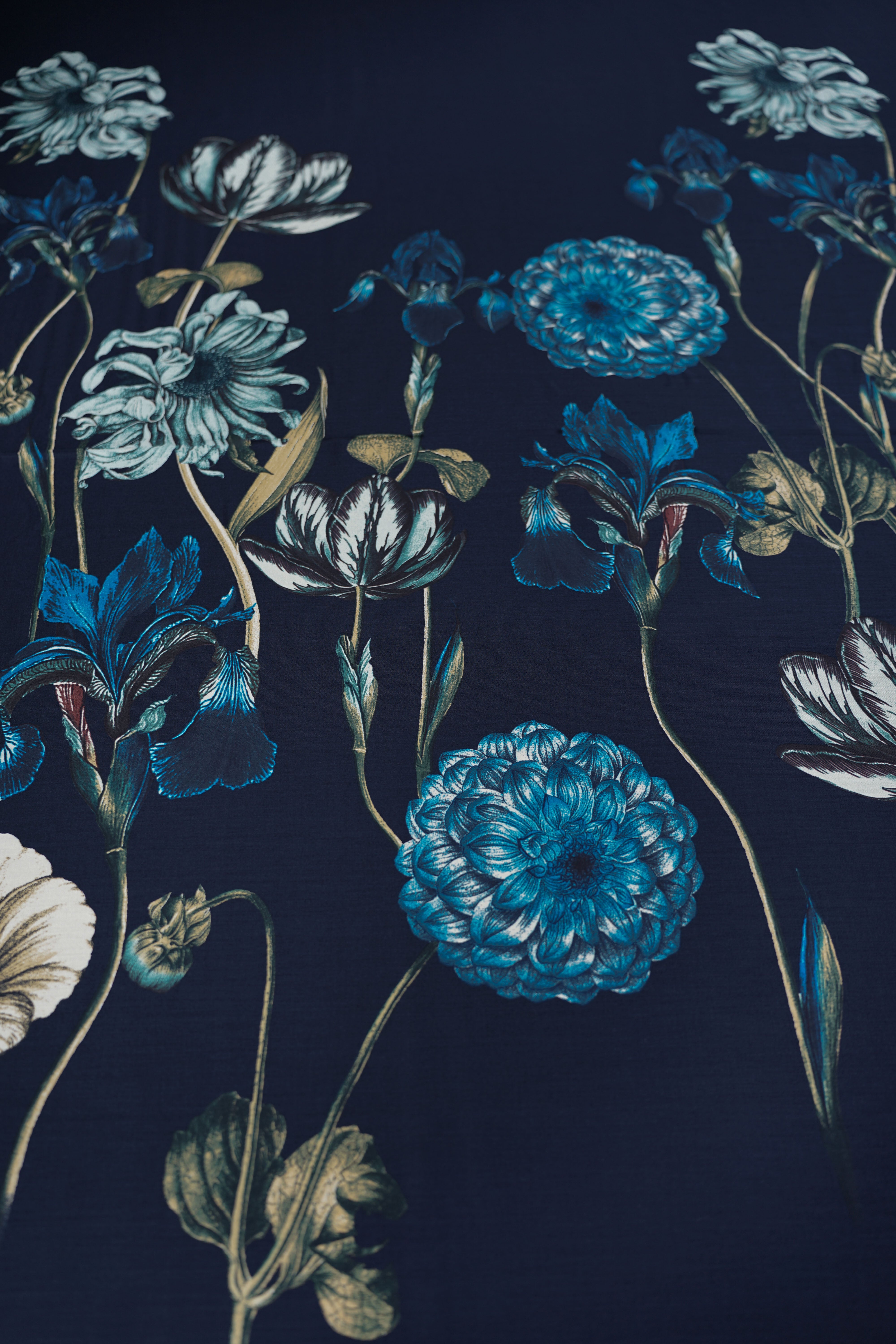• Viskossatin - Stort vackert mönster - Blommor - Marinblå