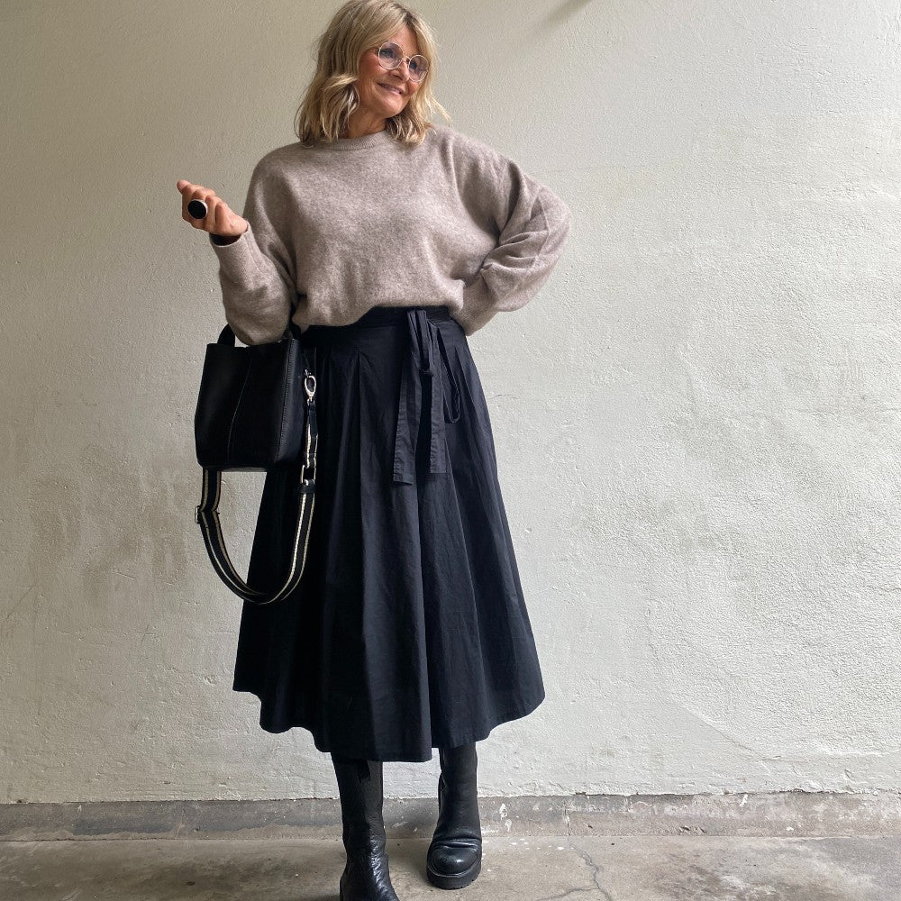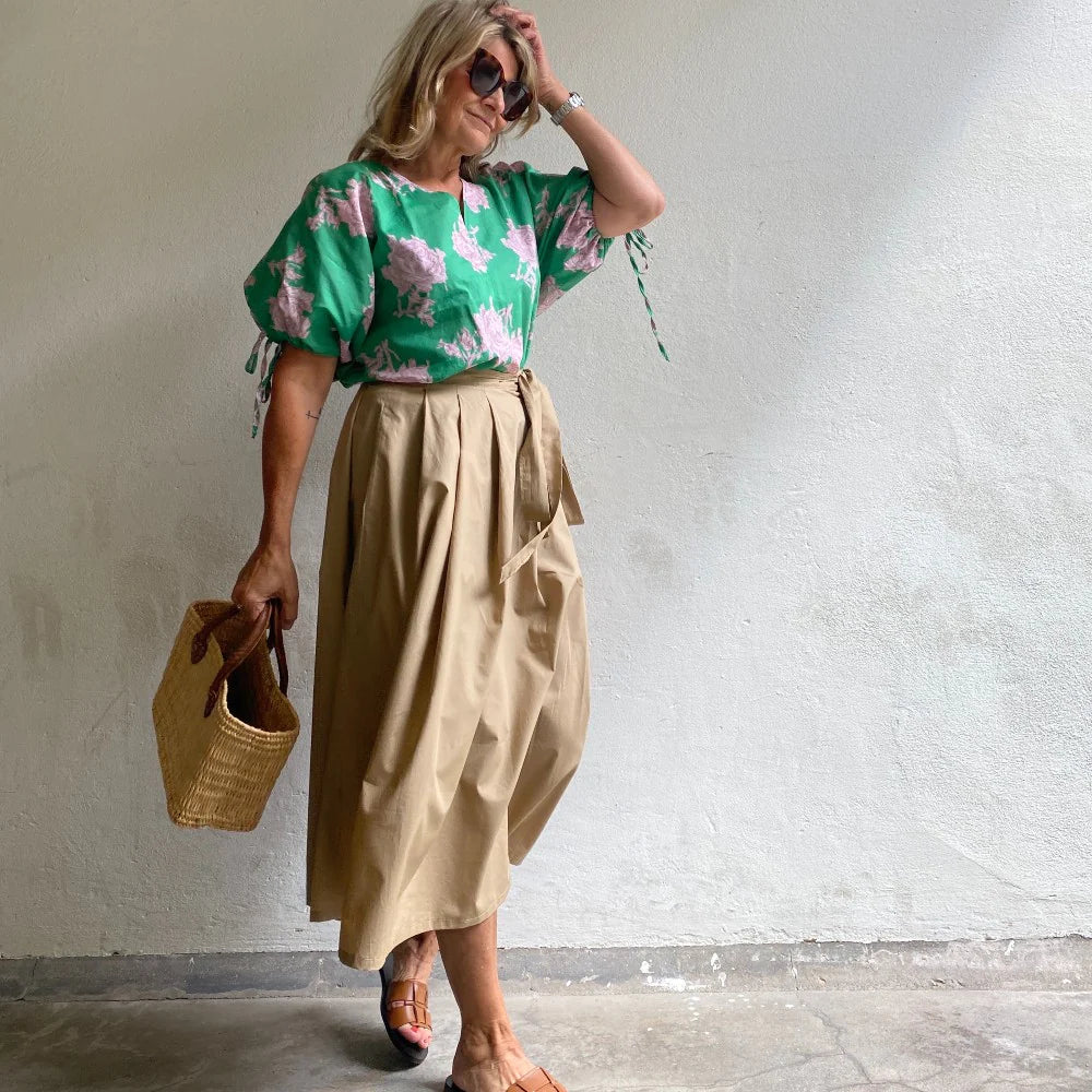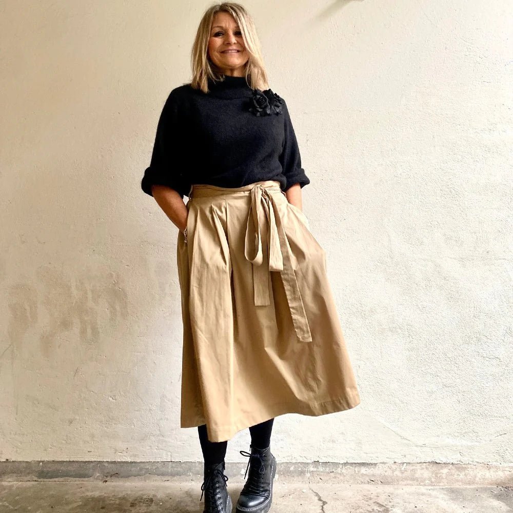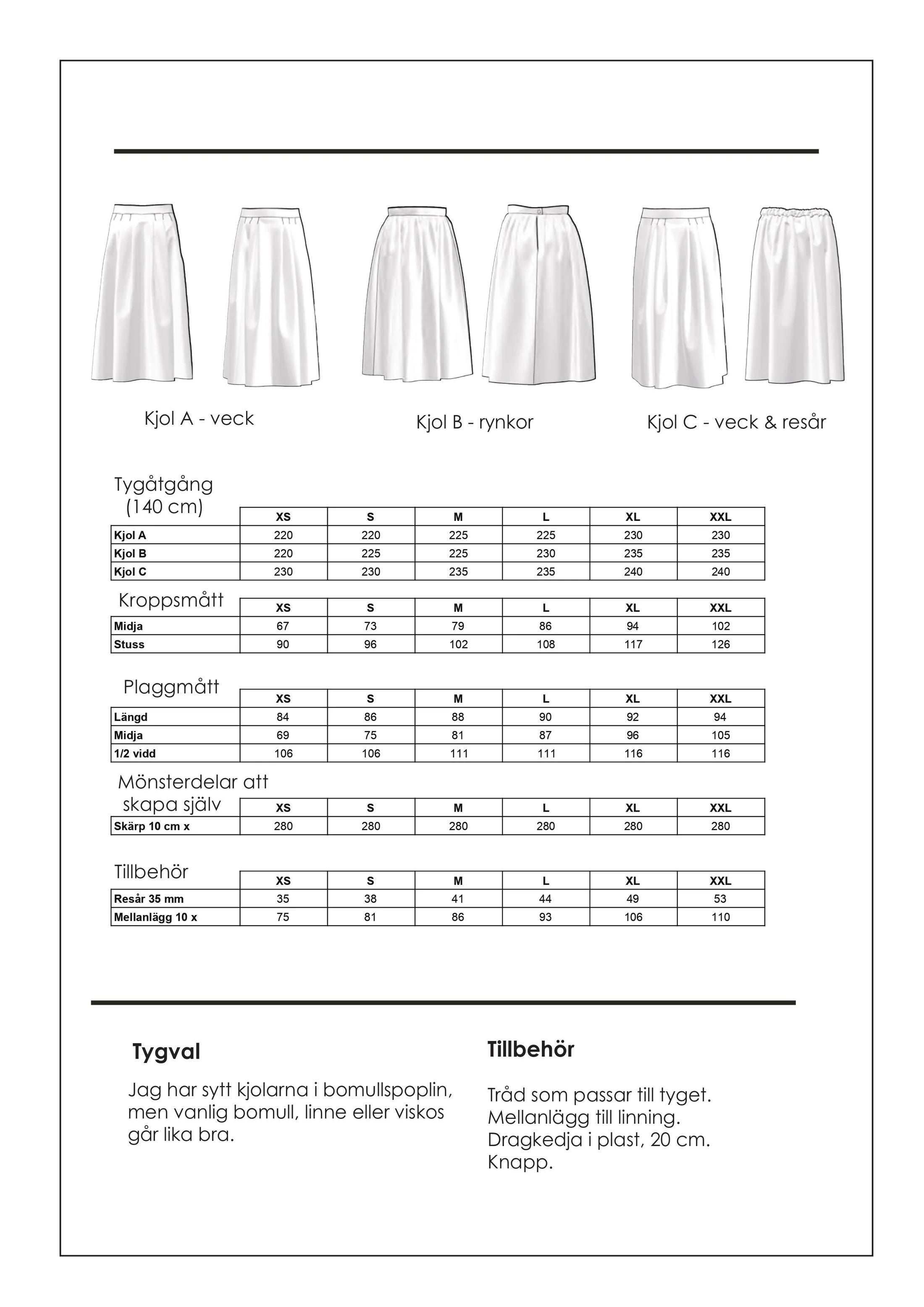 Kjolen Tyra är en härlig kjol som är lite ”vippig” med mycket vidd. Du väljer själv om du vill sy nedsydda veck eller med rynk upptill. Du får beskrivning på både dragkedja i sidan eller baktill. Till beskrivningen där dragkedjan sitter bak finns det även fickor.