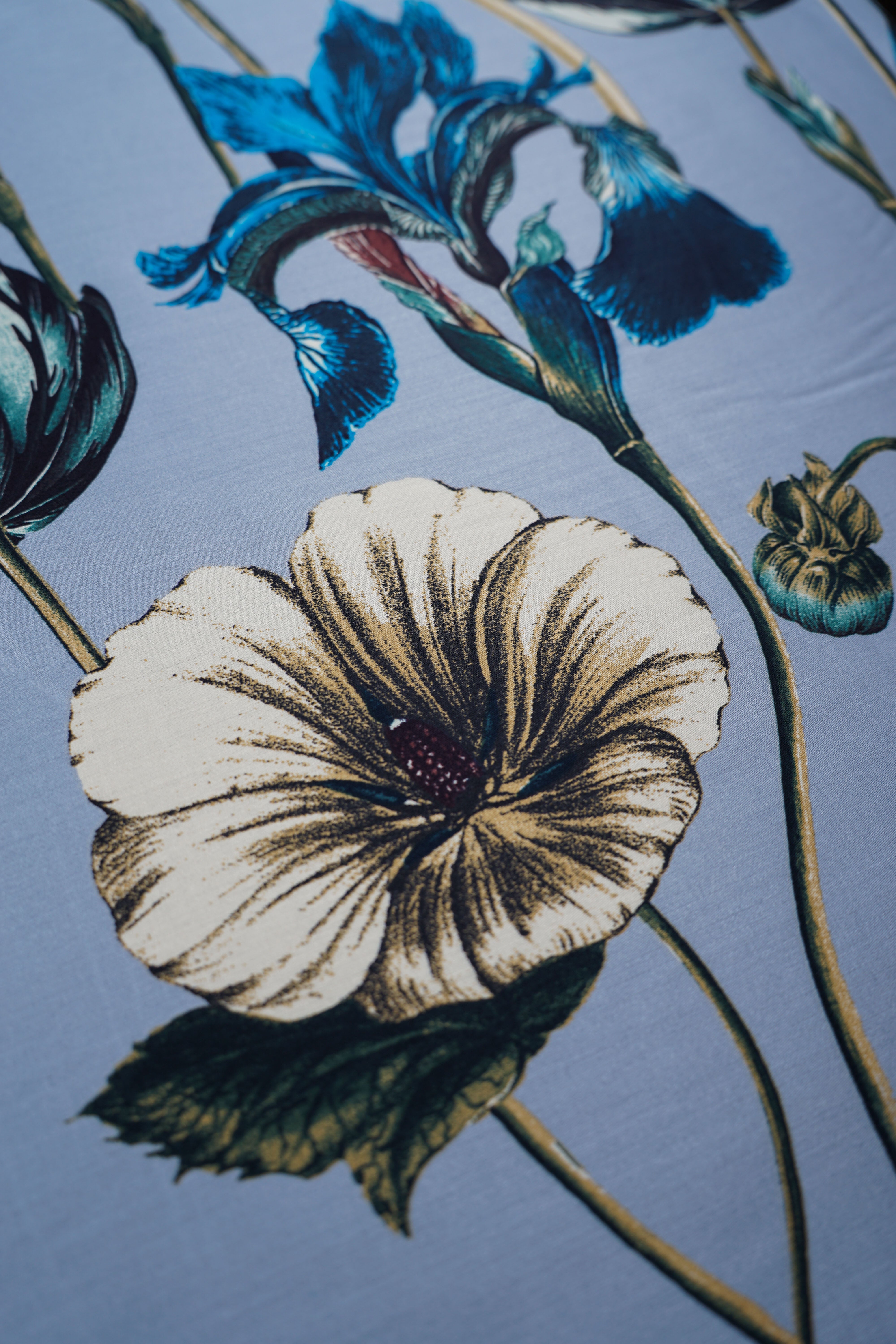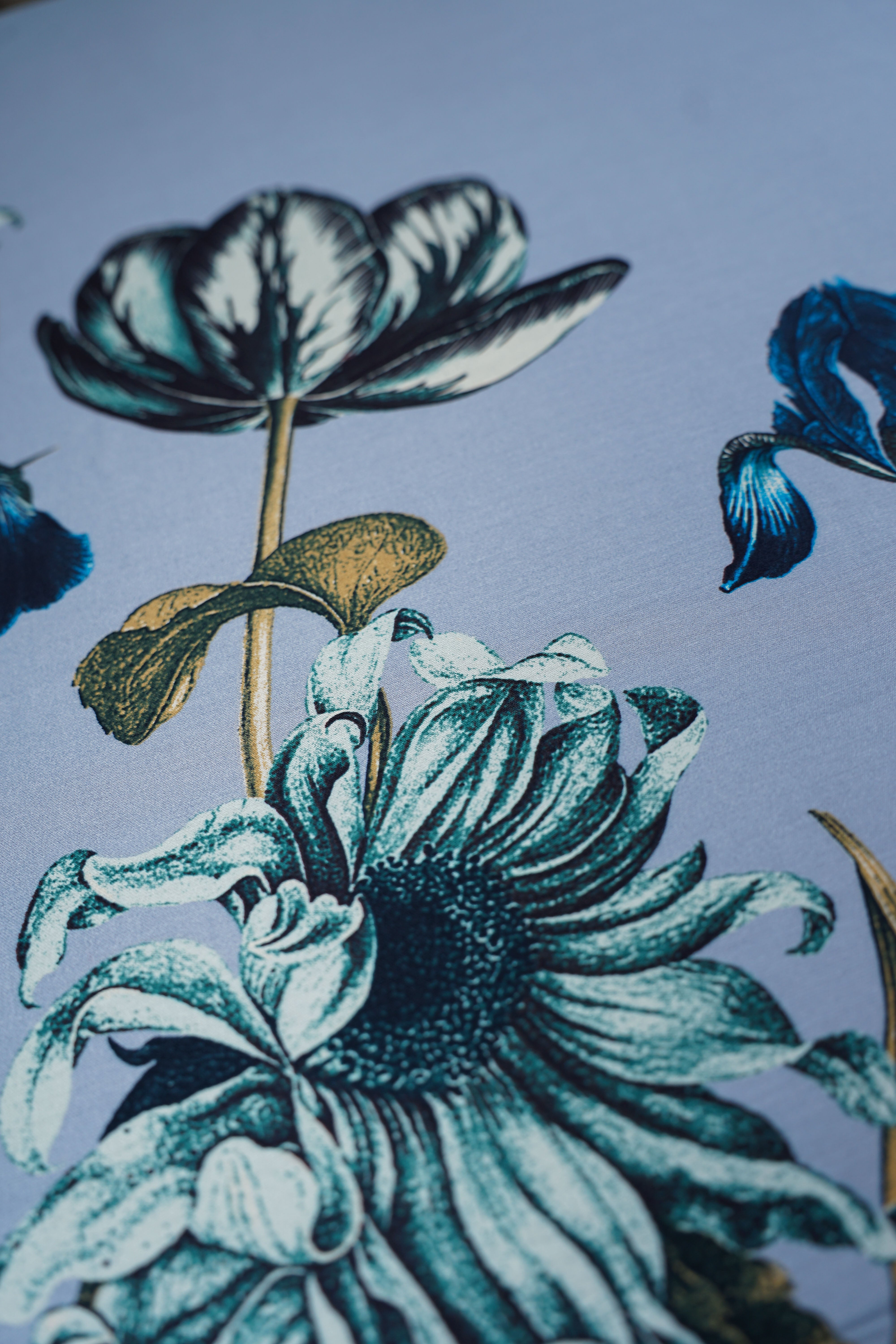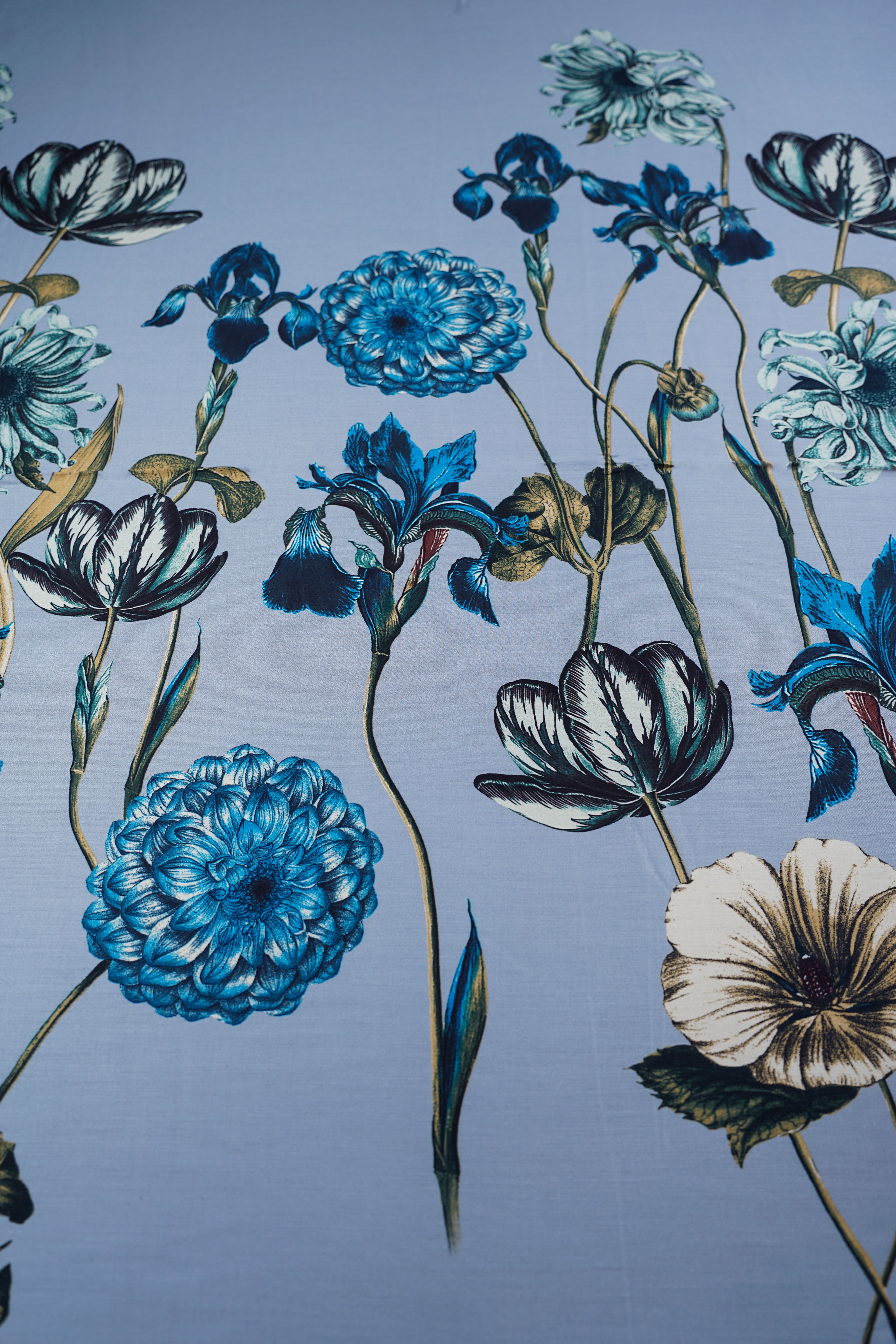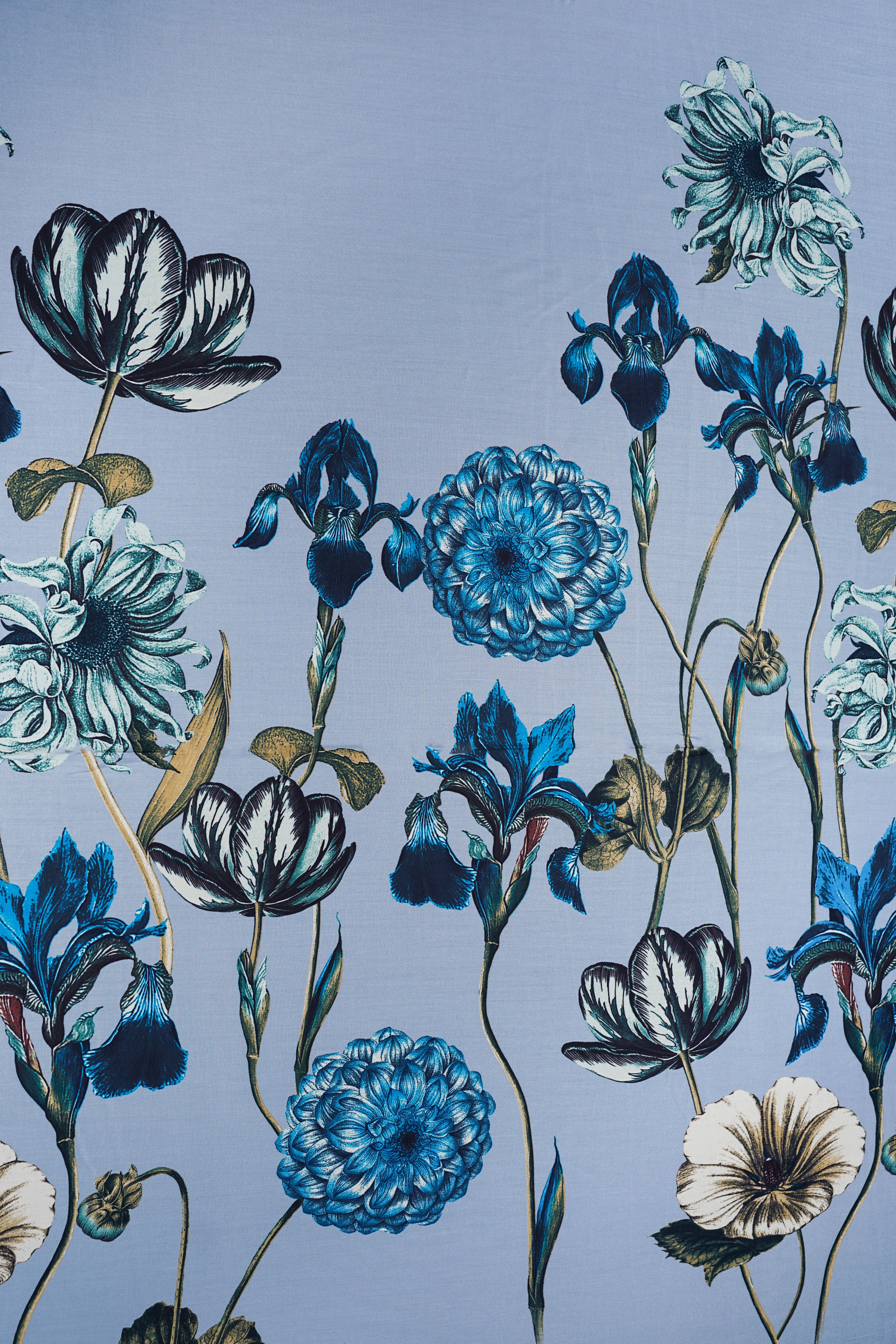 Viskossatin - Stort vackert mönster - Blommor - Ljusblå