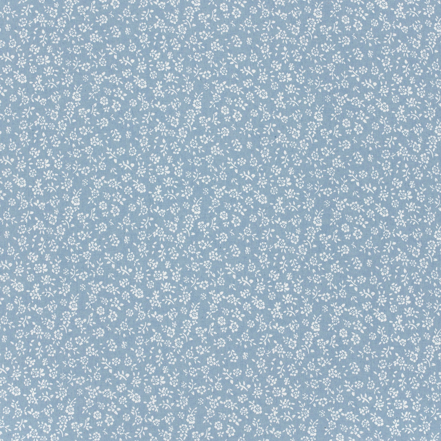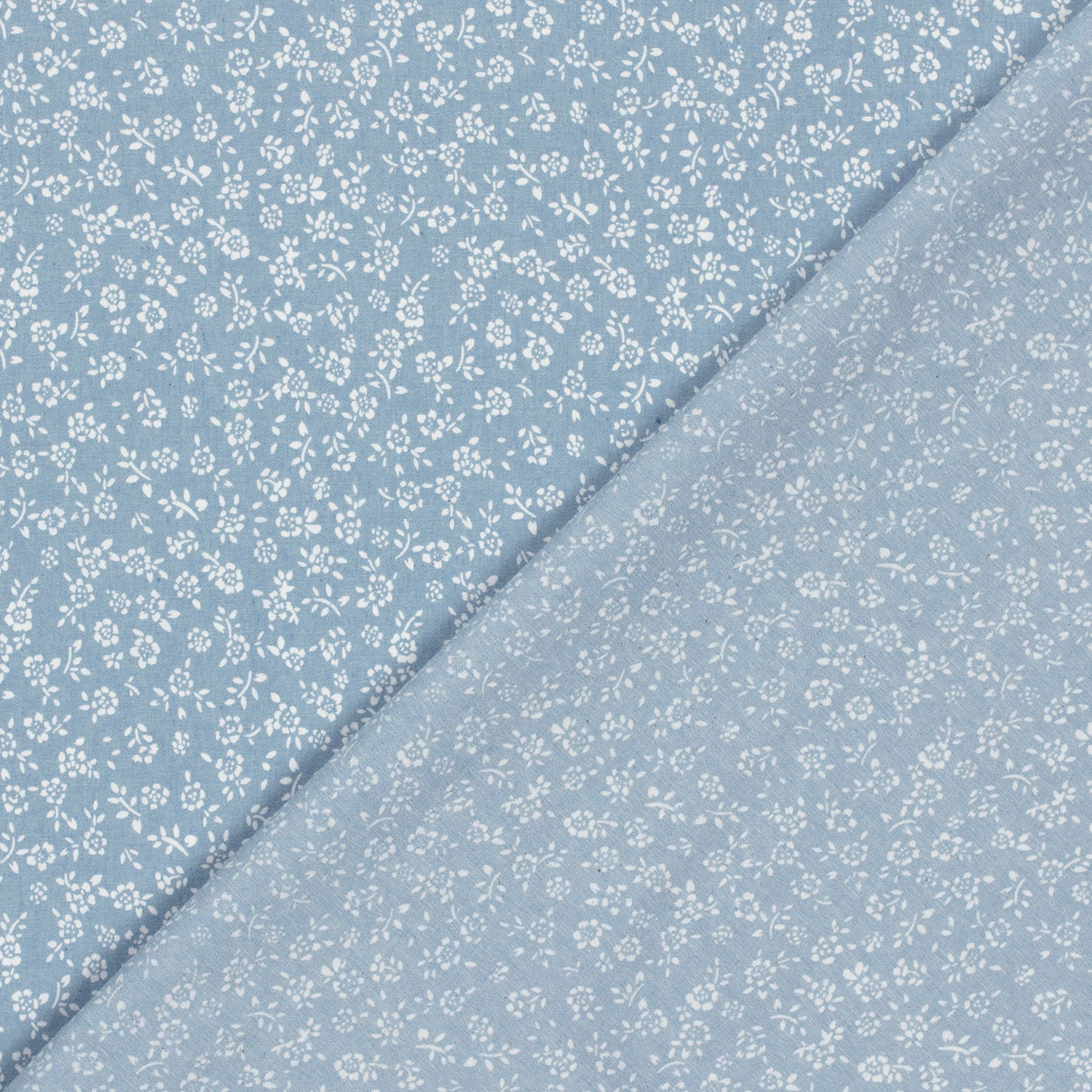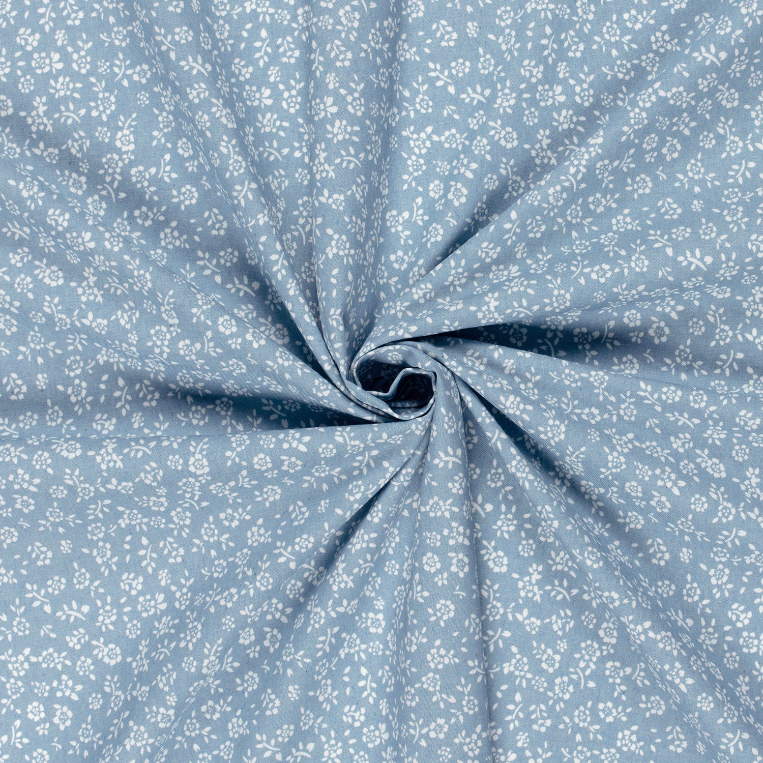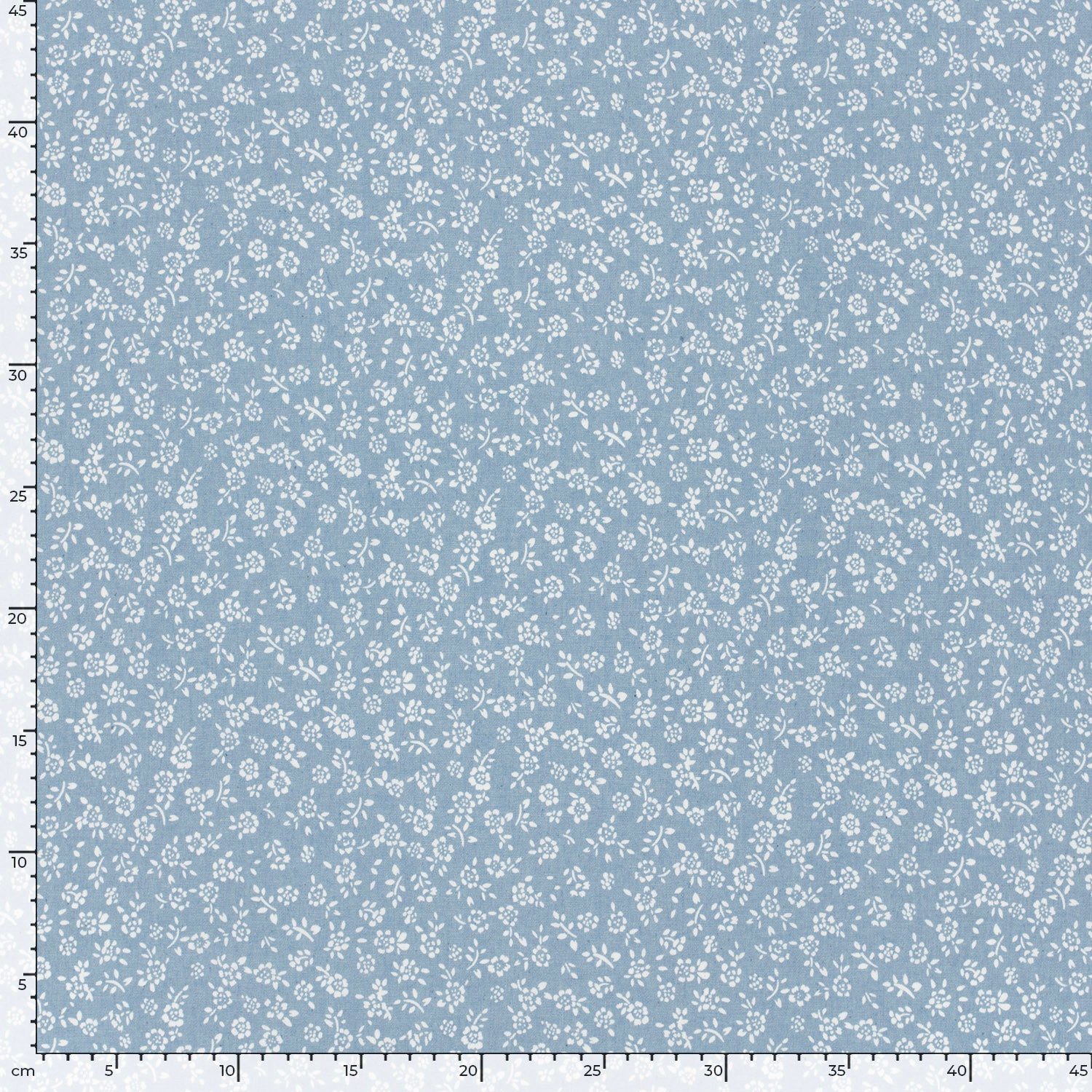 Mönstrad denim med blommorPassar väl till kläder, byxor, kjolar, och mycket merMaterial: 100 % BomullBredd: 147 cmVikt: 130 g/m2Certifikat: Öko-texTvättråd: 30 Grader, ej tumlingFärger på skärmar varierar, är du osäker beställ tygprov.